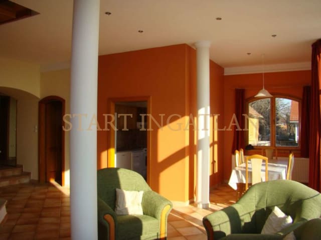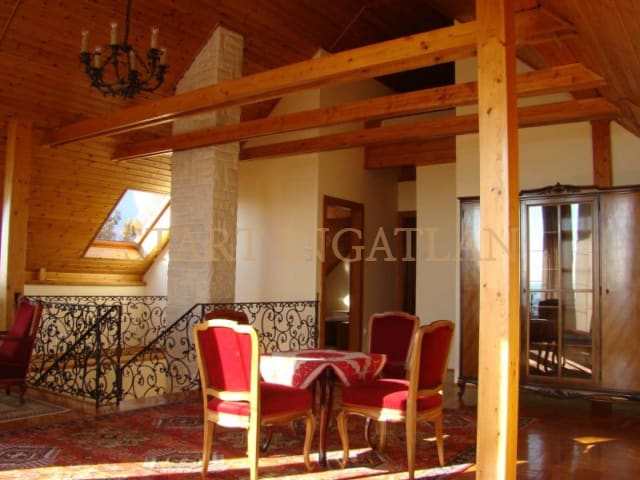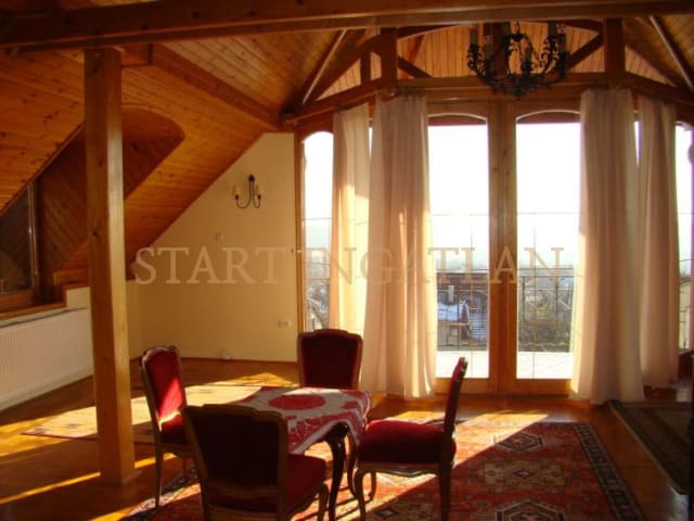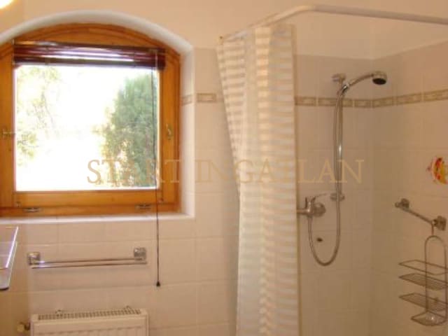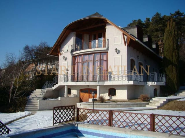 HOUSE WITH PANORAMIC VIEW! 300 sqm 3-storey detached house for rent, built in 2000, in a beautiful garden. The basement level has a garage for 1 car, laundry room/boiler room and a toilet. The 1st floor consists of the entrance hall, 1 bedrooms, 2 bathrooms and the spacious living room with dining area, fireplace, kitchen and terrace access with panoramic view. The top floor has a 2nd living room with terrace access and view, 2 bedrooms (with A/C), 1 bathroom and a seperate toilet. The house equipped with solar cells, a heatable outdoor pool and with 2 extra parking spaces in a seperate building. Pets are welcome! Floorplan!